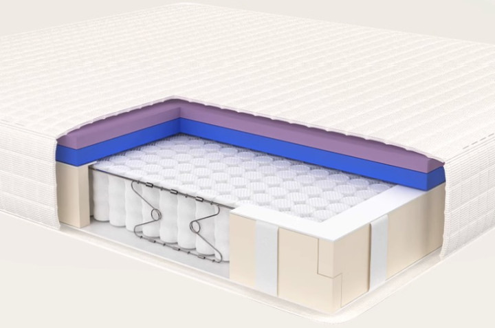 下面这张是栖作官方的剖面图,从产品剖面图可以清晰地看到,栖作坚果3代采用的多层复合结构。最上层默认的是2cm无感高透气记忆棉,其包裹慢回弹的特性,能给身体不同部位带来更饱满的贴合感。第二层是2.5cm含25%大豆油提取物的生物基小蓝垫,其2.5cm厚度能给身体提供足够支撑。最后一层是由840个6.5圈0胶水独立袋装弹簧组成的基层,其独特的四叶型排列,能更好的贴合人体曲线。